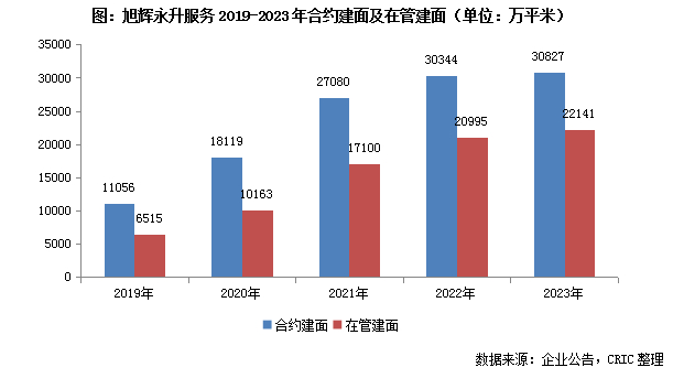 在物业管理方面,截至2023年底旭辉永升服务的签约管理面积达到了3.08亿平方米,在管面积约为2.2亿平方米,营业收入同比增长4.2%至65.37亿元。在保持规模稳定发展的同时,旭辉永升服务也在客户之间树立了良好的口碑。值得注意的是,旭辉永升服务2023年的毛利率为19.2%,同比下降了1.4个百分点,在营收增长的情况下毛利润却出现了减少,陷入了“增收不增利”的境况。