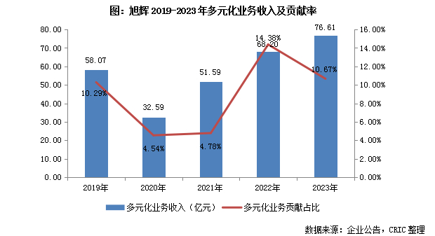 根据旭辉提出的“三五战略”,企业未来要加大力度推进轻资产的发展以拥有穿越周期的能力。整体来看2023年旭辉的多元化业务发展仍然相对顺利,其多元化业务收入为76.61亿元,同比增长了12.34%。但是对总收入的占比则同比降低了3.71个百分点至14.38%,主要是因为销售结算收入的大幅增加。由于企业的销售规模近年来持续减少,预计未来结算收入也会随之降低,营收相对稳定的多元化业务可能会在集团营收中占有更大的比重。