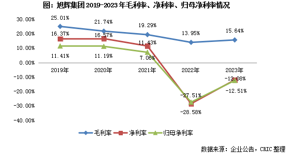 2023年旭辉实现营业收入718.33亿元,同比增长了51.42%,其中物业销售收入为641.71亿元,占比约89.3%。企业的毛利润同比增长了69.7%至112.33亿元,因此毛利率同比略微提升了1.68个百分点至15.64%。毛利率虽然有所回升,但是旭辉的净利润却仍然出现了86.79亿元的巨额亏损。究其原因,一方面是因为企业的债务危机导致其融资成本继续增加,另一方面则是因为企业对其存货继续计提了87亿元的减值准备,同比翻番。