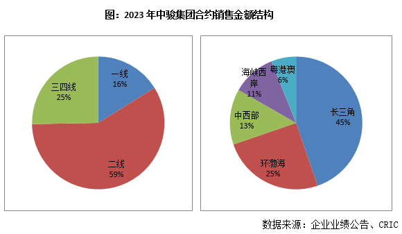从区域分布来看,长三角经济圈及环渤海经济圈是主要业绩贡献区域,合同销售金额分别为约124亿元及69亿元,占整体合同销售金额分别为约45%及25%。从城市能级来看,一线及二线的合同销售金额分别为45亿元及163亿元,分别占比16%及59%;而三四线城市销售金额占比相比2022年下降了7个百分点至25%。