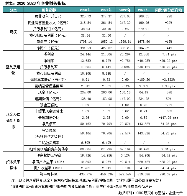 由于持有现金大幅减少,以及所有者权益的大幅下滑,2023年末中骏集团的净负债率从2022年的79.57%快速上升至143.82%。剔除预收账款后的资产负债率为76.47%;非受限现金短债比为0.21。