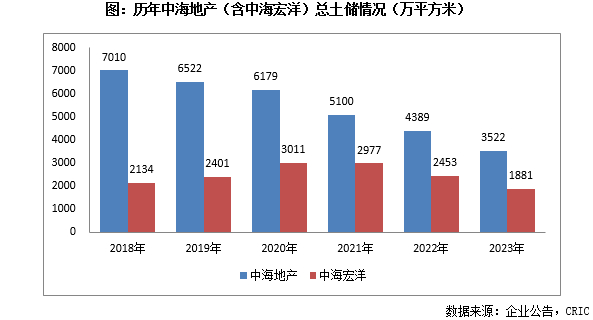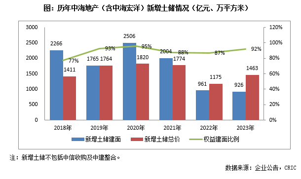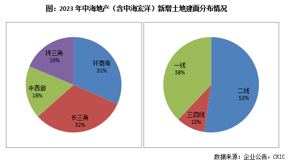 从城市能级来看,中海地产(含中海宏洋)于一二线的新增土储建面占比达到了90%;尤其是一线占比38%,同比2022年增加了25个百分点
