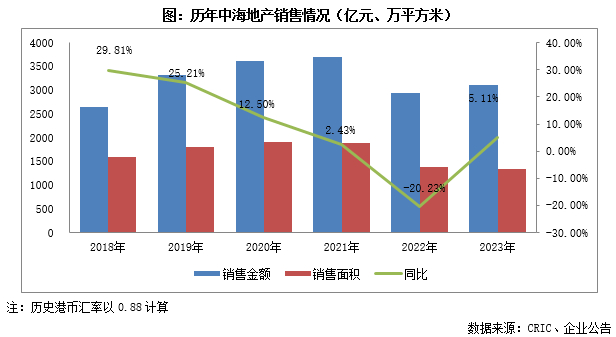 2023年中海地产(含联营合营公司)共实现合约物业销售金额约3098亿元,同比上升5%;销售面积约1336万平方米,同比下降4%;销售均价23189元/平米,同比增长9%。