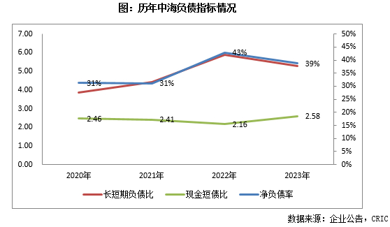 截止2023年底,中海地产银行结余及现金为1056亿元(包括受规管的物业预售所得款为208亿元),较2022年略有下降4%。扣除受限制现金后的现金短债比为2.07,长短期债务比5.29。