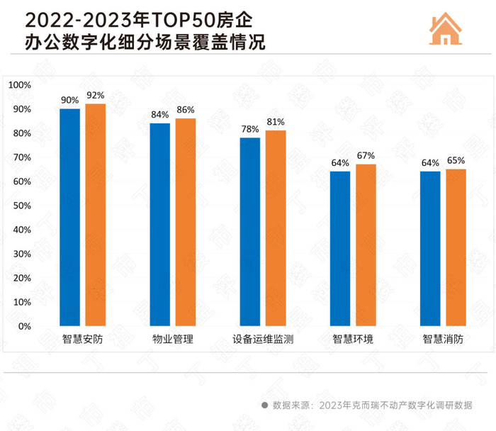 据克而瑞数据调研显示,在头部房企的应用场景中,智慧安防、物业管理覆盖率高达近九成,设施运维监测、智慧环境、智慧消防成为高频应用场景,这些应用均是以数字化驱动降本增效为目标。