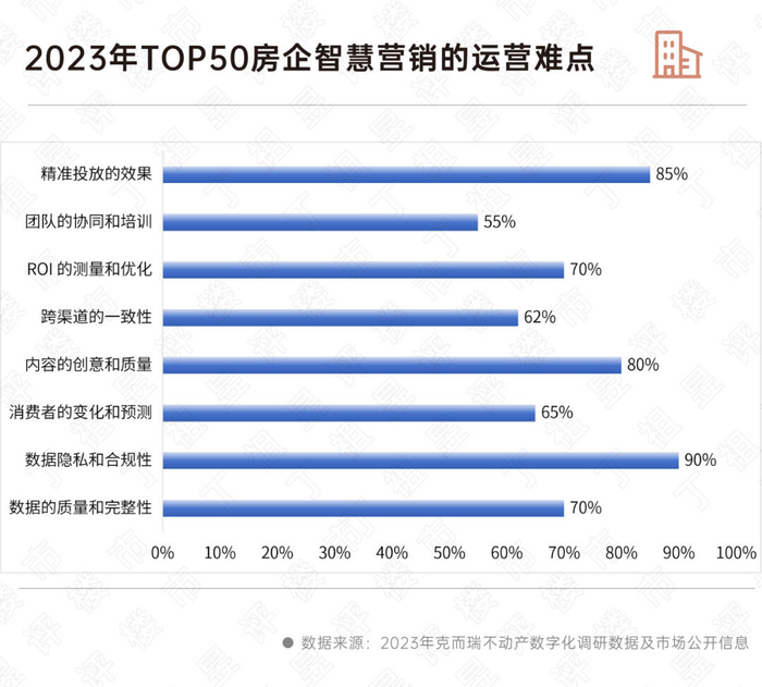 智慧营销是数字化在不动产行业渗透率最高的领域。克而瑞对头部房企的智慧营销研究数据显示,数据隐私和合规性、精准投放的效果和内容的创意和质量成为三大核心运营难点。