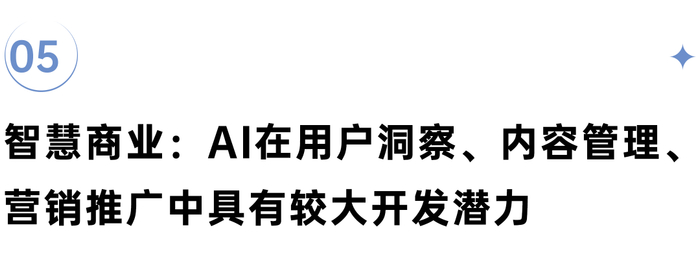 AI促进智慧拓客和智慧运营应用开发,比如营销内容的自动化生成、虚拟试穿与产品展示、智能客服与导购、互动营销与活动推广、数据分析与消费者洞察、内容管理与数字资产管理均获得快速发展。
