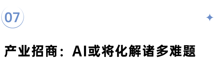 AI推进和大数据赋能,使得产业招商大脑实现升级迭代,产业招商难题正被逐步化解。AI技术已经面向政府、园区产业服务、企业服务提供AI助手、工具等,展现出较强优势,同时聚集特定区域内主导产业链上下游,围绕核心产业的建链、补链、强链的特色招商有明显优势和发展前景。