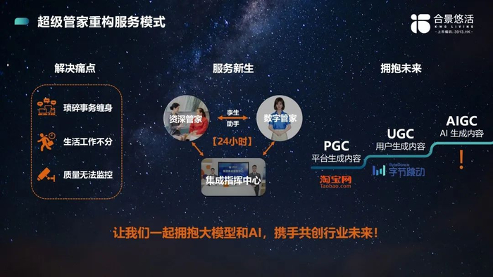 AIGC智能客服实现了人工替代。2023年5月,合景悠活与腾讯云开发了客服大模型,通过对物业行业的特定语料、法律法规、客户服务数据和业务信息进行深度学习和训练,从而构建一个能够自动聚合工单的智能系统。另外,合景悠活在人际触点、物理触点及数字触点上做了全新的设计和搭建了全新的架构,推出“码上悠享”、超级管家等产品。