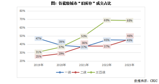 2.2 “旧库存”成交占比:一二线仍低于五成,三四线近两年骤升33个百分点