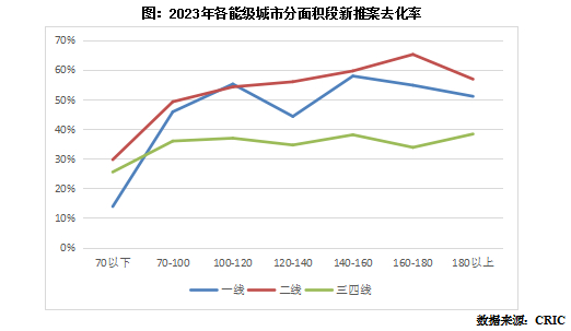 与“旧库存”成交占比类似,三四线城市各面积段的新推案去化表现不及一二线,去化率均在四成以下。虽然目前典型城市新推案去化率已经不到五成,但对于主打一二线140平方米以上的大户型项目而言,对于新推案去化率的预期还是可以保持一定信心。