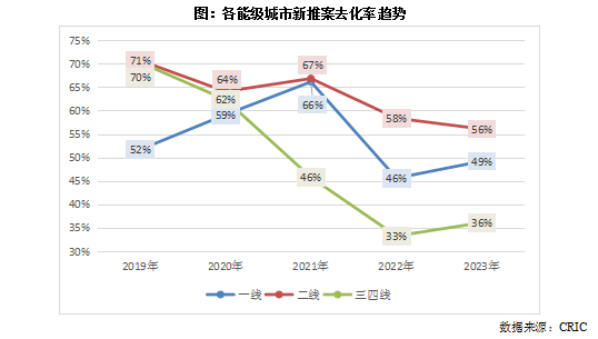 2.1 新推案去化率:2023年三四线降至三成,一二线平均依旧超过50%
