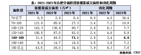 进一步联系市场规模指标来看,同样是120-180平方米产品表现更佳,其中140-160平方米产品不仅交易规模逆势翻番有余,去化指标也是各面积段最佳。2023年,合肥120-180平方米面积段产品的新推案成交面积达到173万平方米,较2021年增加了22%,其中140-160平方米面积段的新推案成交面积更是较2021年增长133%至73万平方米,接近100-120、120-140等传统主力面积段。并且2023年末4个月的消化周期,也是各面积段最低的。主打该面积段的招商置地中海璟园、万科朗拾、高速信达等项目均在2023年取得了上佳的销售表现,其中璟园项目更是以52亿高居2023年合肥项目成交金额榜单首位。此外160-180平方米面积段的市场份额增加也值得关注,2023年末新推案房源成交面积达到18万平方米,较2021年增长九成。