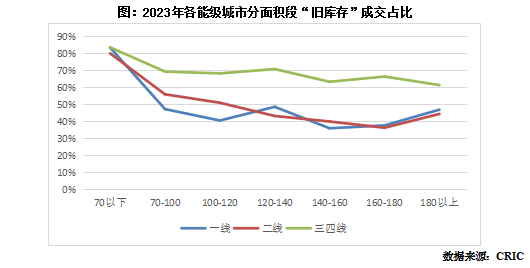 在70平方米以上面积段,各能级城市的差异明显拉开,三四线城市“旧库存”成交占比均明显高于一二线,其中又以160-180平方米差距最为显著。