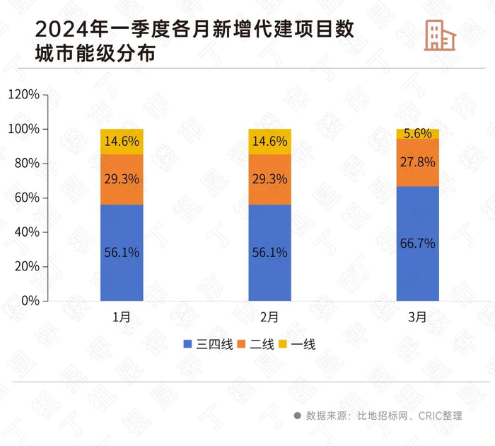 三四线城市是代建增量的主要来源,一季度中标代建项目有59.3%位于三四线,占比接近六成。一线城市占比为11.9%。二线城市是28.8%。