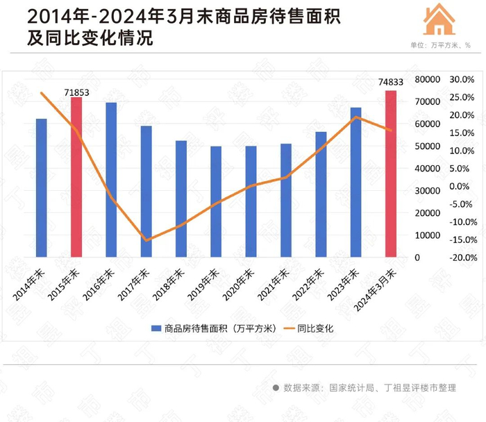 先来看一组国家统计局数据,2024年3月末商品房待售面积74833万平方米,同比增长15.6%,住宅待售面积增长23.9%。