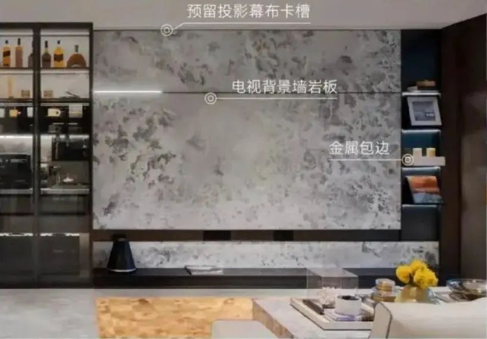 比如南京万科·朗拾在客厅空间通过无主灯悬浮吊顶的应用,使灯光与空间融为一体,营造出一种“见光不见灯”的感受。在客厅的电视背景墙上,使用了欧珀冰晶拼接的岩板,岩板上方预留了投影幕布卡槽,为日后的观影提供了便利和灵活性。