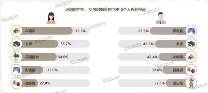 克劳锐发布的《品牌社交营销——家居家装篇》调研显示,男生、女生对于理想的个人兴趣空间有比较大的差异。女生最想拥有的个人兴趣空间TOP5依次是衣帽间、书房、花园露台、影音室、健身房,而男生最想拥有的个人兴趣空间依次是影音室、书房、衣帽间、健身房、潮玩柜。