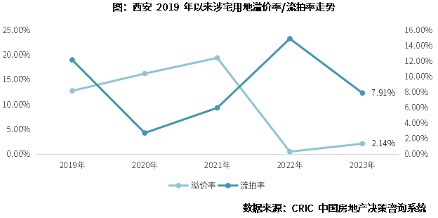 从地市热度来看,因2021年下半年地产行情“急转直下”,地市溢价率下行、流拍率上升,而至2023年整体地市热度止跌回升,涉宅用地流拍率为7.91%,相比2022年流拍率有所降低,2023年末涉宅用地溢价率为2.14%,溢价率相比2022年略有提升。