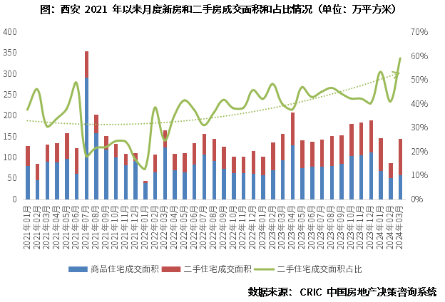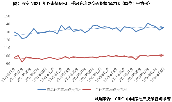 事实上,自2022年末以来,西安二手房市场份额便呈现出逐月递增态势,自住需求刚需消费降级,涌入二手房市场置业,分流新房热度。据CRIC监测数据,2021-2022年二手房成交面积占比仅有3成,而2024年一季度这一占比增至53%,二手住宅成交规模持平甚至反超新房。