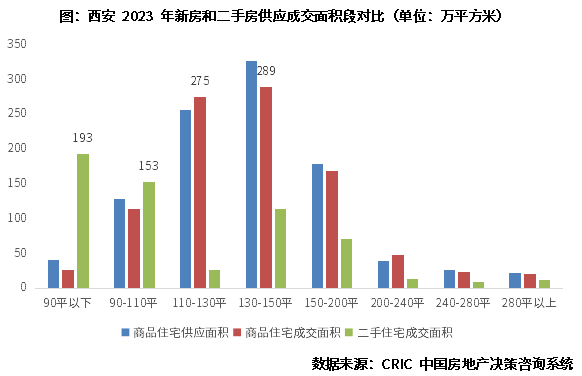 西安新房和二手房存在显著的客群差异,新房主要集中改善客群,二手持续分流刚需,从新房和二手房主力成交面积段我们不难看出端倪,据CRIC监测数据,2023年新房主力成交面积段集中在110-150平,二手房主力成交面积段集中在110平以下,二者成交占比均接近6成。二手房主力成交面积段显著低于新房。
