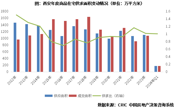 纵观西安历年来新房供给和成交变动情况,可以大体分为以下三个阶段:第一阶段2012年-2014年,供大于求,但供求比持续降低;第二阶段2015年-2021年,供不应求,即便在2015-2018年年成交量均保持在1500万平方米以上,整体供应量基本保持在1000-1200万平方米波动,整体对于新房供应也相对比较克制。第三阶段2022年至今,供求持稳,基本围绕供求比1波动,供给导向更为显著。