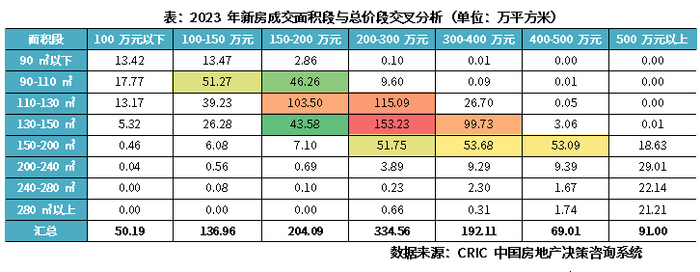 改善+内卷是2023年产品端的主要特征,新房面积段130-150平方米,总价段200-300万元是最为集中的产品区间,市场分化特征明显,总价段 300万元以上成交面积占比提升。