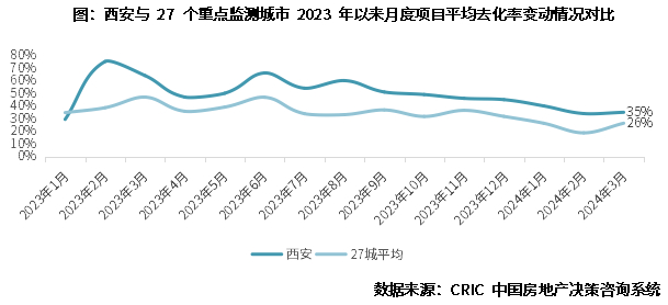 从城市月度平均去化率变动情况来看,西安仍显著高于27个重点监测城市平均去化率。自2023年年初以来27城平均去化率保持稳中有降态势,西安热度始终保持在平均线以上,至2024年3月末西安平均去化率尾35%,仍高于27城平均去化率9个百分点。