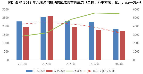 纵观西安涉宅用地市场供求趋势,近5年整体供地规模稳步下行,以此带动涉宅用地成交规模稳中有降,不过因政府坚持“提质缩量”,整体地价保持稳中有增,至2023年成交楼面价达5527元/平,仍处阶段性高位。