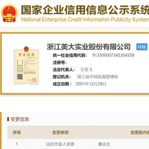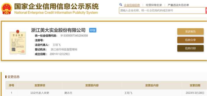 2023年年初,几则消息没有引发太多关注。2月13日,浙江美大(002677.SZ)发布关于董事会换届选举的公告。据公告,浙江美大董事会同意提名王培飞为第五届董事会非独立董事候选人。一个月后,3月28日,浙江美大的工商信息显示,董事长夏兰和副董事长、总经理夏志生从“高级管理人员”中退出,而王培飞新增为董事长。隔天,王培飞的身份再度发生改变,浙江美大法定代表人从“夏志生”变更为“王培飞”。