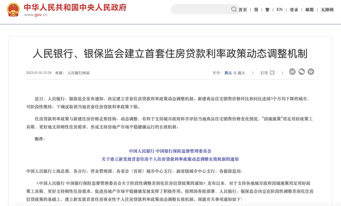 自2023年1月人民银行、银保监会建立首套住房贷款利率政策动态调整机制以来,新建商品住宅销售价格环比和同比连续3个月均下降的城市,可阶段性维持、下调或取消当地首套住房贷款利率政策下限。