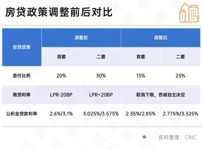 1、下调首付比5个百分点,调整后首套最低首付比例15%、二套25%;
