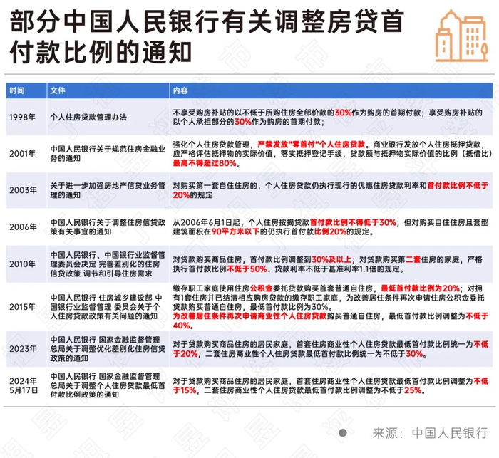 一直到2024年5月17日,人民银行将全国层面的首套房贷最低首付比例从20%降至15%,二套房贷最低首付比例从30%降至25%。