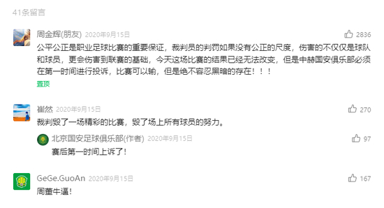 周金辉忍不住了。他在球队公众号后面留言炮轰,说裁判员的判罚如果没有公正的尺度,伤害的不仅仅是球队和球员,更会伤害到联赛的基础: