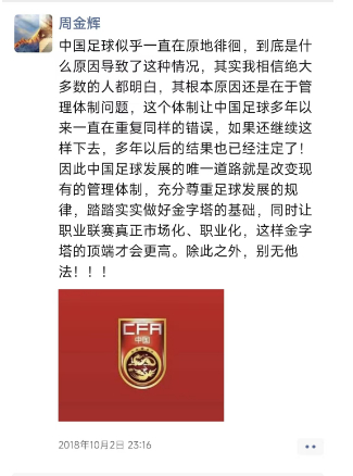 2018年8月,高层领导找几家中超俱乐部投资人,去国务院开会,讨论中国足球职业改革。周金辉也去了。