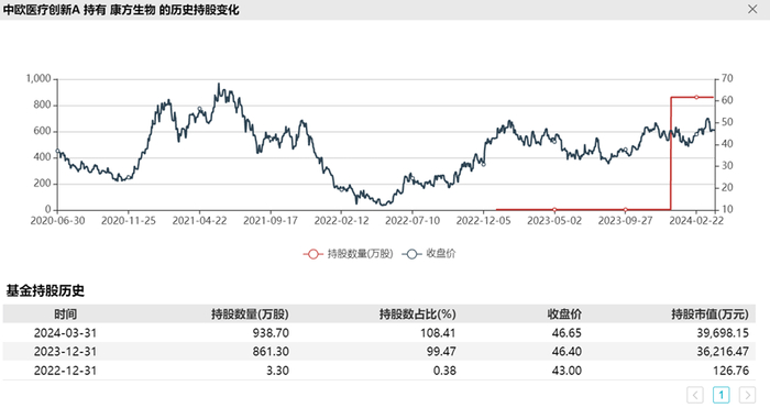 2019年四季度中欧医疗健康混合A首次建仓药明康德,持有328.28万股,此后不断加仓,最高峰在2021年第四季度单季度增持2480.67万股,最高峰时持有6571.60万股。