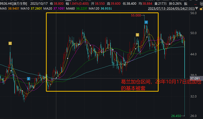 港股创新药龙头股康方生物股价闪崩,跌幅一度接近45%。这正是葛兰重仓的第六大股,一季度末持仓市值近4亿。