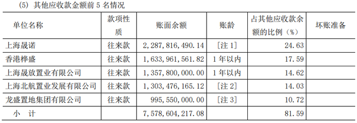 浙江龙盛在资金方面持续向两家地产公司输送资金,其他应收款前5名名单中,上海晟诺和龙盛置地两家公司均在列。浙江龙盛对上海晟诺和龙盛置地的其他应收款账面余额分别为22.88亿元和9.96亿元,占其他应收款余额的比例分别为24.63%和10.72%。