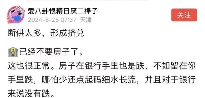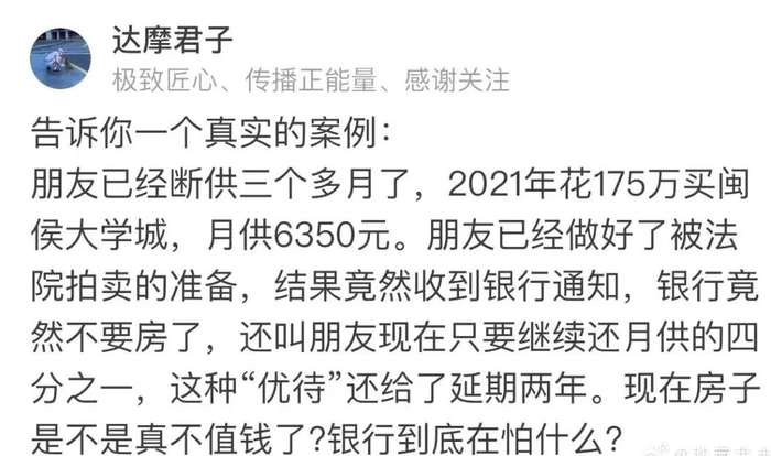 对于银行而言,其实只要每月有房贷进账,哪怕少一点,房子就可以不算是“断供”,就不会被走流程拉到拍卖场上,进而不会对当前的房地产市场形成低价挤兑,进而维护好现有新房市场,便于新房市场去库存......