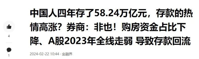 ▲据统计显示,从2020年初到2024年1月,中国家庭大约银行账户里存款净增加了58.24万亿元,相当于2009年到2019年的新增存款总和,其中82%是定期存款。