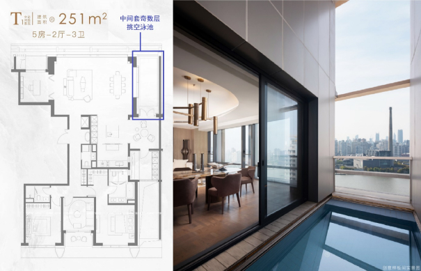 如保利世博天悦坐拥一线临江资源,西边套打造270度视野、两面望江。同时,在奇数层中间套的T1户型设计中,通过挑空打造4米大进深的空中泳池,增加进深空间、实现中间套的双面采光,以约11-13米超宽L型采光面的户型创新打造产品差异化。