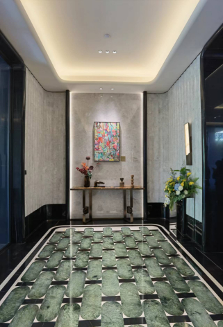 上海宸嘉嘉佰道项目,通过艺术化的公区打造传达出前卫的设计和艺术理念,将艺术感精致地融入到社区的每一个角落。社区大堂通过劳伦黑金与雅柏白大理石的设计拼接,增强了空间的层次感,赋予了大堂独特的艺术气息和视觉冲击力。漫步在项目中,精美的艺术品与流畅的弧形设计也随处可见,它们相互辉映,共同营造出一种流动的艺术美感,为公区空间注入了无限的生命力和艺术气息。