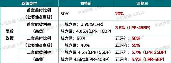 一是降首付比例,商贷和公积金贷款首套首付比例由30%降为20%,二套首付比例五环内由50%降为35%,五环外由40%降为30%;