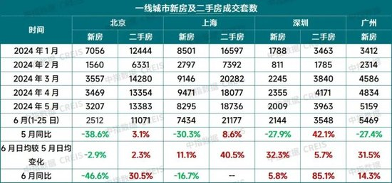 2024年以来一线城市新房和二手房成交情况。来源:中指研究院