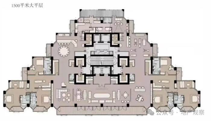 对了,这是1500平的大平层户型图,金字塔形状尽量让每个房间能面朝南向没有遮挡,60米面宽和14个阳台的加持甚至让人怀疑住进去会不会迷路。