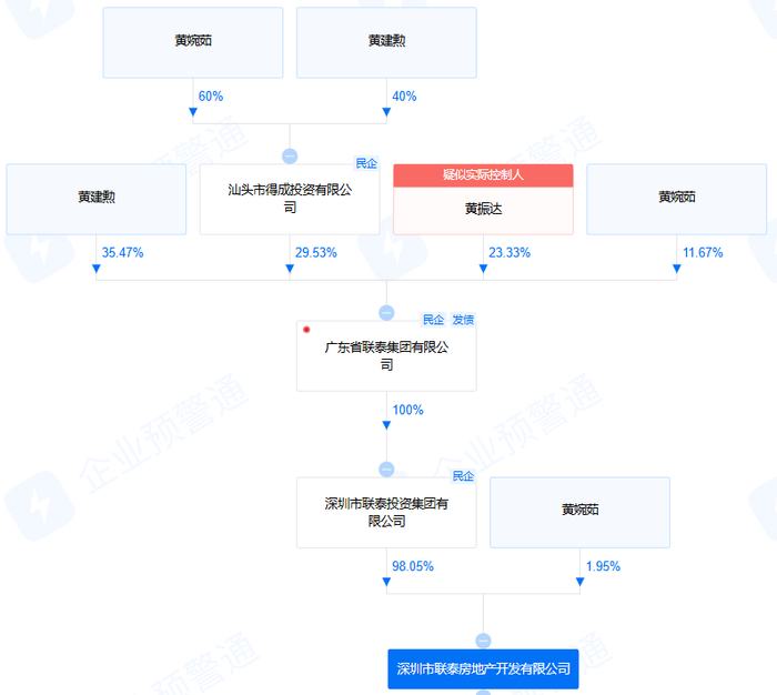 深圳联泰的法定代表人和董事长为黄建勳,黄婉茹为董事,黄振达也在此担任董事。黄振达、黄建勳和黄婉茹三人在深圳联泰的受益股份分别为22.88%、46.36%、30.76%。
