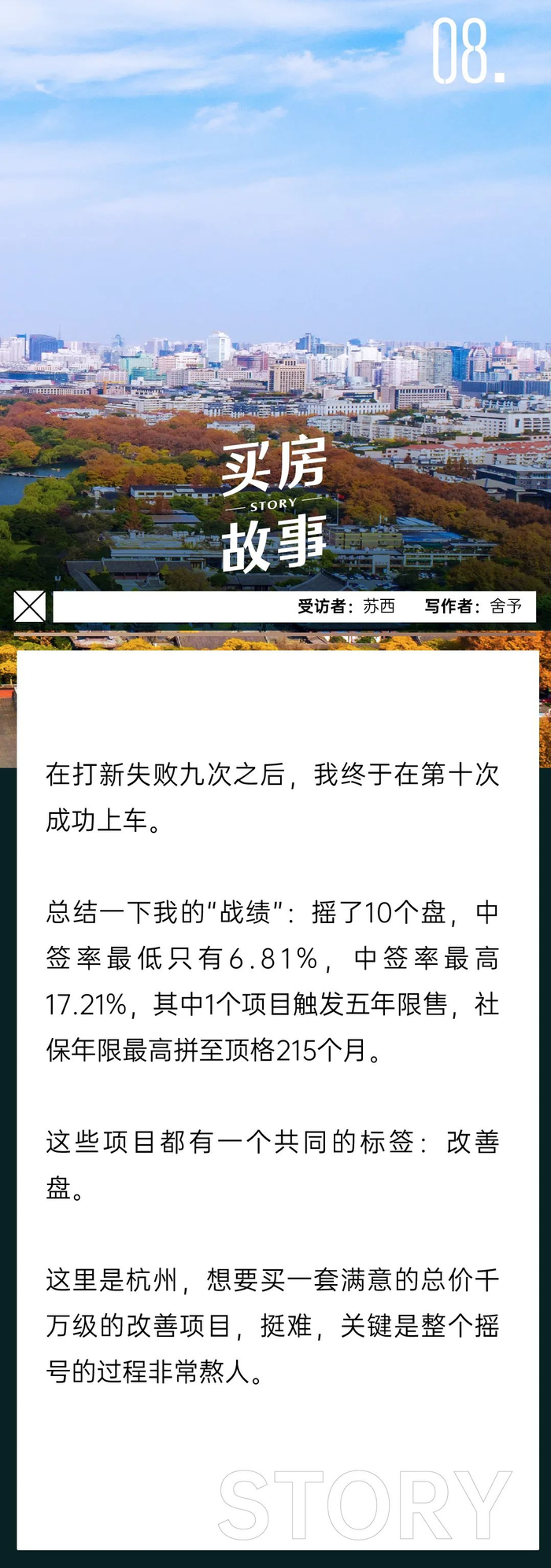 今年3月,我们开始陆续看房,没想到,参与摇号的第一个盘,就成了杭州2024年以来第一个触发社保排序的项目,普通家庭社保年限要165个月,整体中签率11.9%。