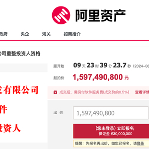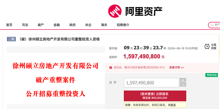 乐居财经 张林霞 8月9日,据阿里拍卖网,徐州硕立房地产开发有限公司破产重整,公开招募重整投资人,起拍价15.97亿元,预计开拍时间为8月19日。