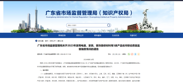 乐居财经 李兰 8月19日,广东省市场监督管理局通报关于2023年家用电器、家具、装饰装修材料等3类产品省市联动质量监督抽查情况。