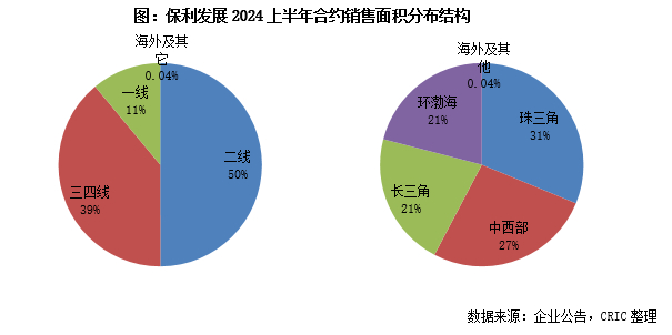 从城市能级来看,二线城市的销售面积占比相比于2020年全年略微降低了1个百分点至50%,一线城市销售面积占比由10%提升至11%。整体看来,2024上半年保利的销售区域和能级的分布相比于2023年全年的变化并不是很大。
